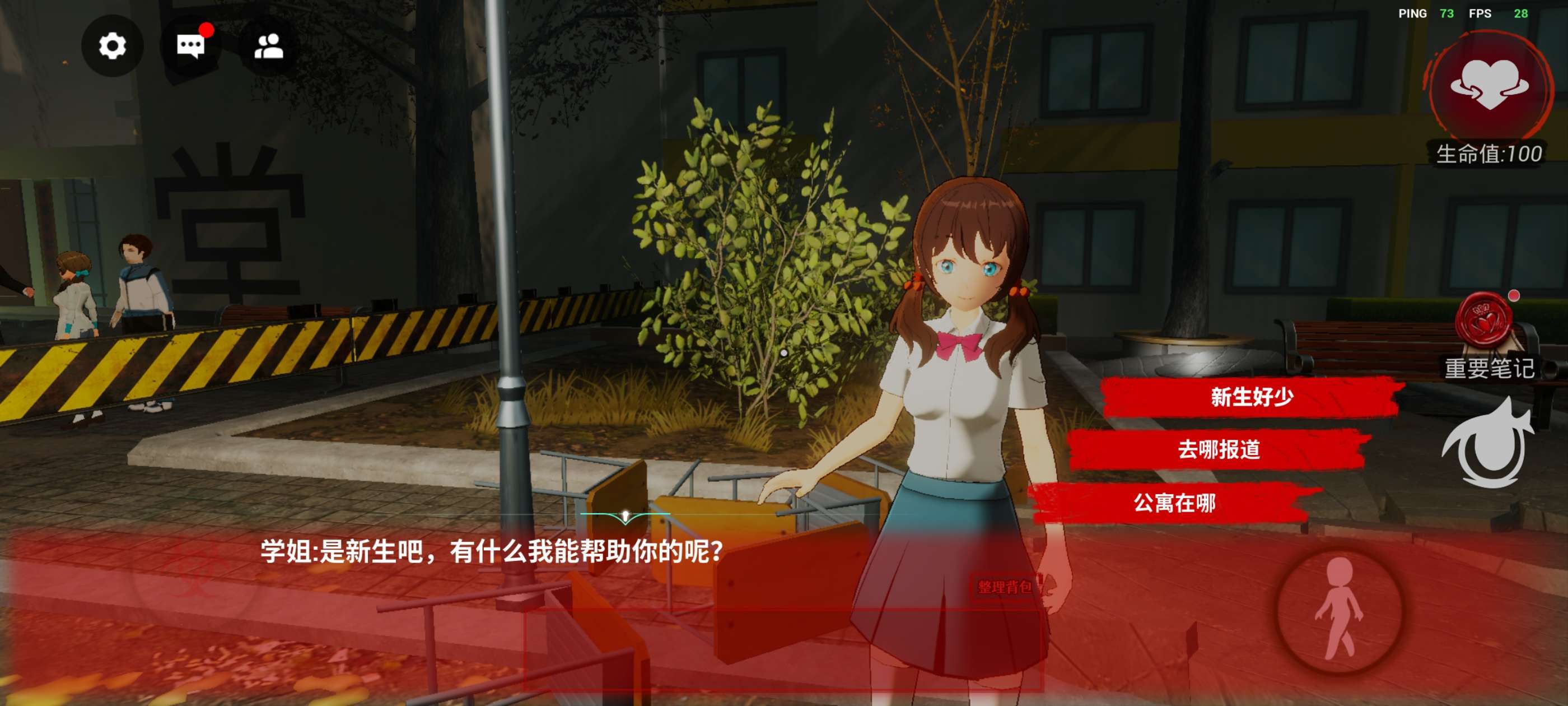 开始游戏后,经过一段出租车剧情,我们来到学校大门,跟随地上的箭头进入学校。这里顺便说一下我们的游戏界面里的操作: