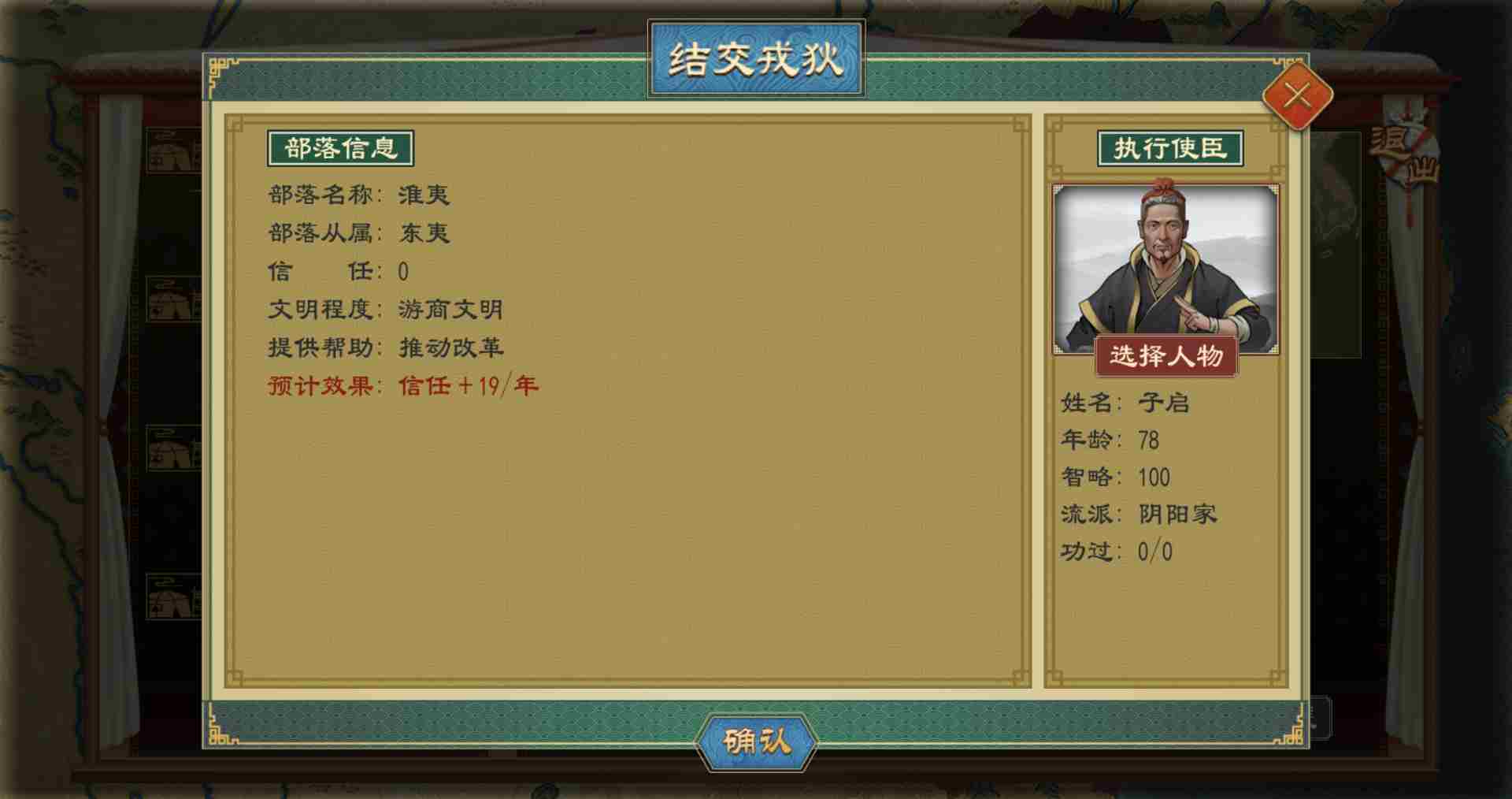 玩家可以和戎狄部落进行外交,派出使节后增加与当前戎狄的信任值。