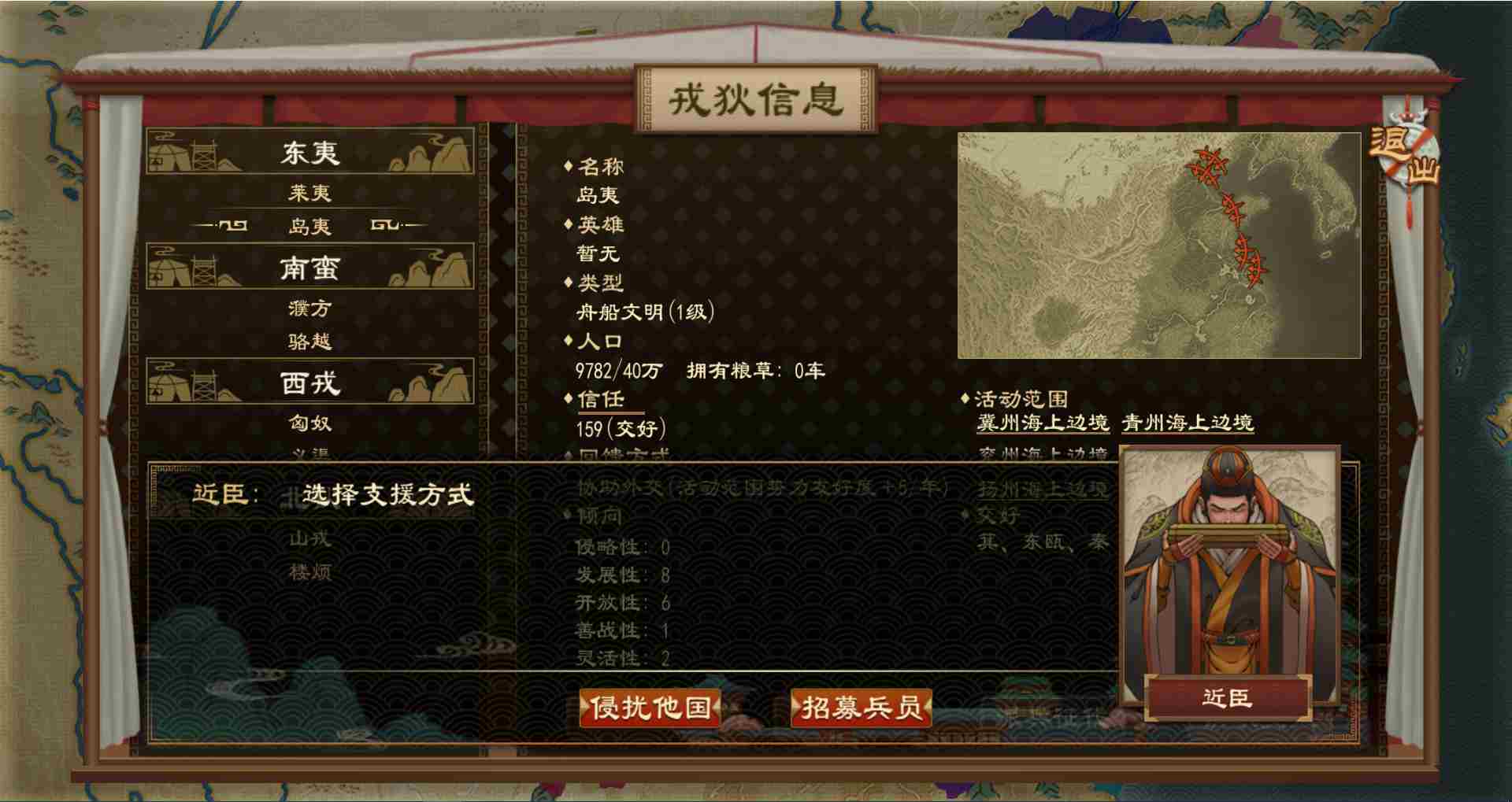 戎狄向玩家支援的方式有两种,侵扰他国和招募兵员。