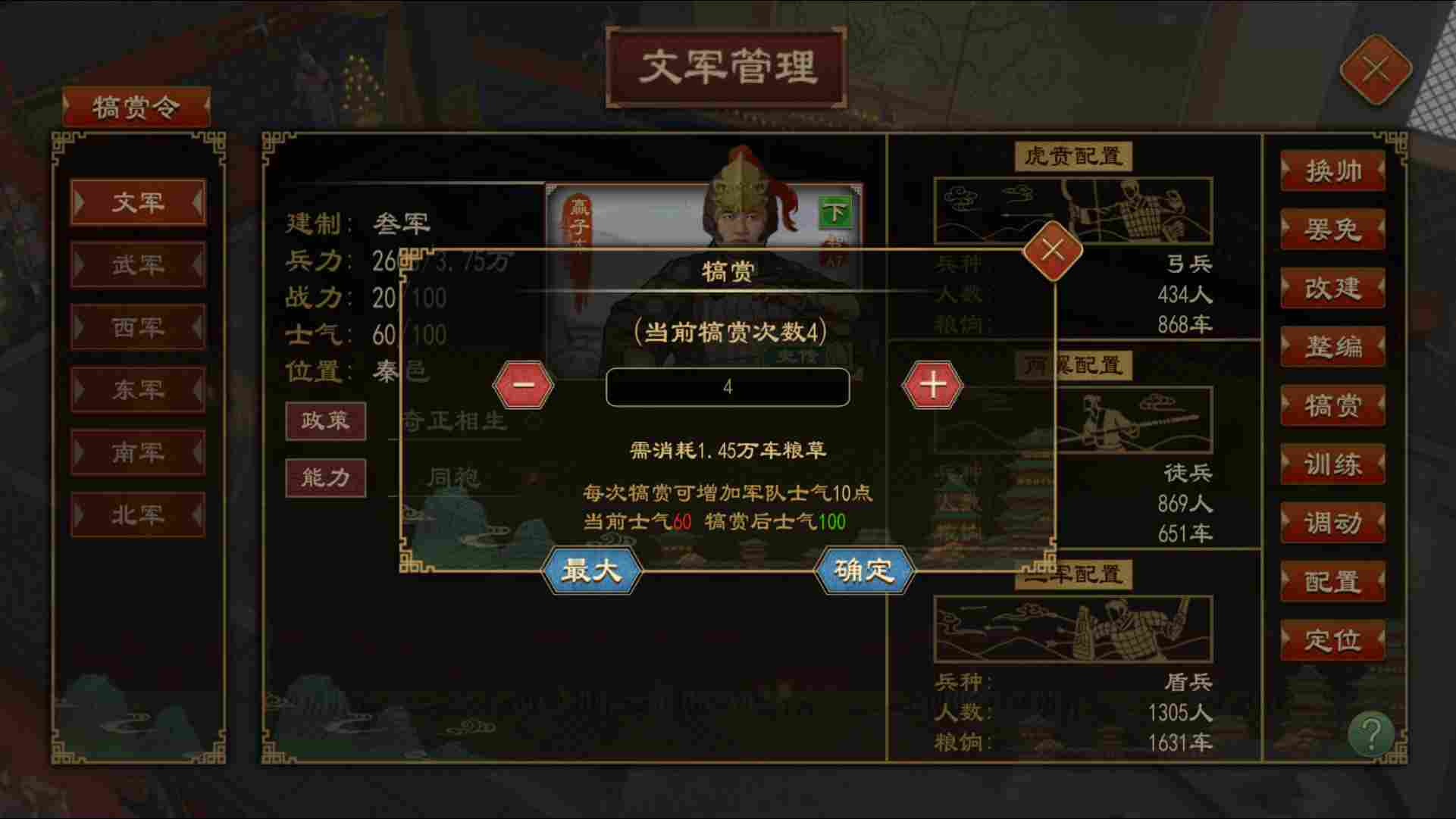 士气过低会导致士兵出逃,可以通过消耗粮草犒赏提高军队士气,每次犒赏提升10点士气。
