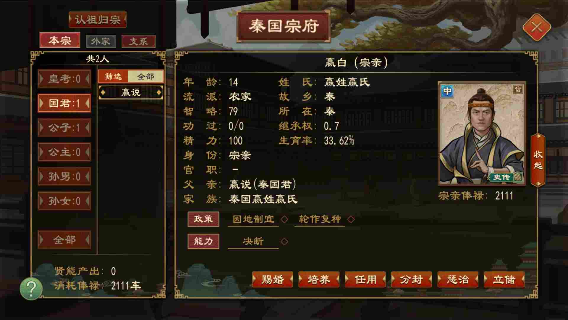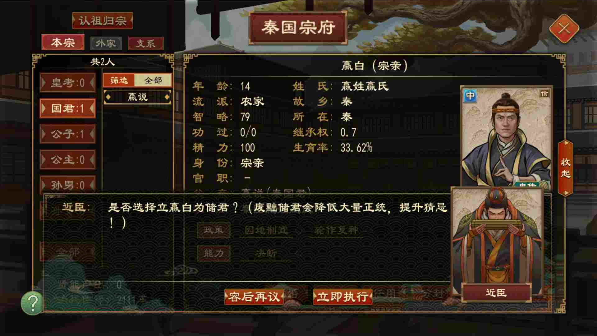 在“都城-宫廷-儿女-人物详情”中可以选择合适的子嗣进行立储, 废储将会产生负面影响 。