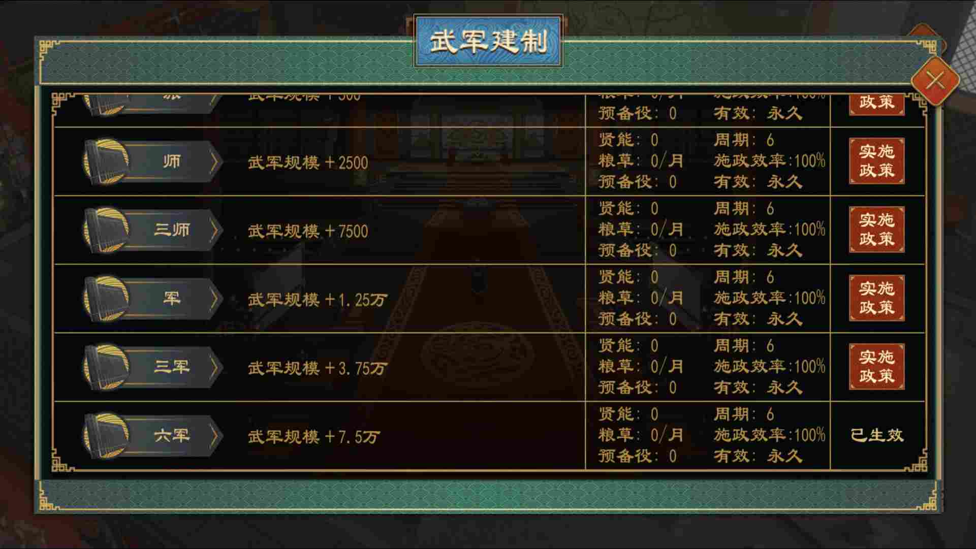 国土扩大时,会受到多个方位国家的威胁。当同时向多个国家宣战或者同时被多个国家宣战时,仅一两支军队是远远不够的,所以需要在战争之前进行军队组建。游戏内最多可同时拥有六支军队,在军队界面可以进行组建或者扩建,以及军队整编。