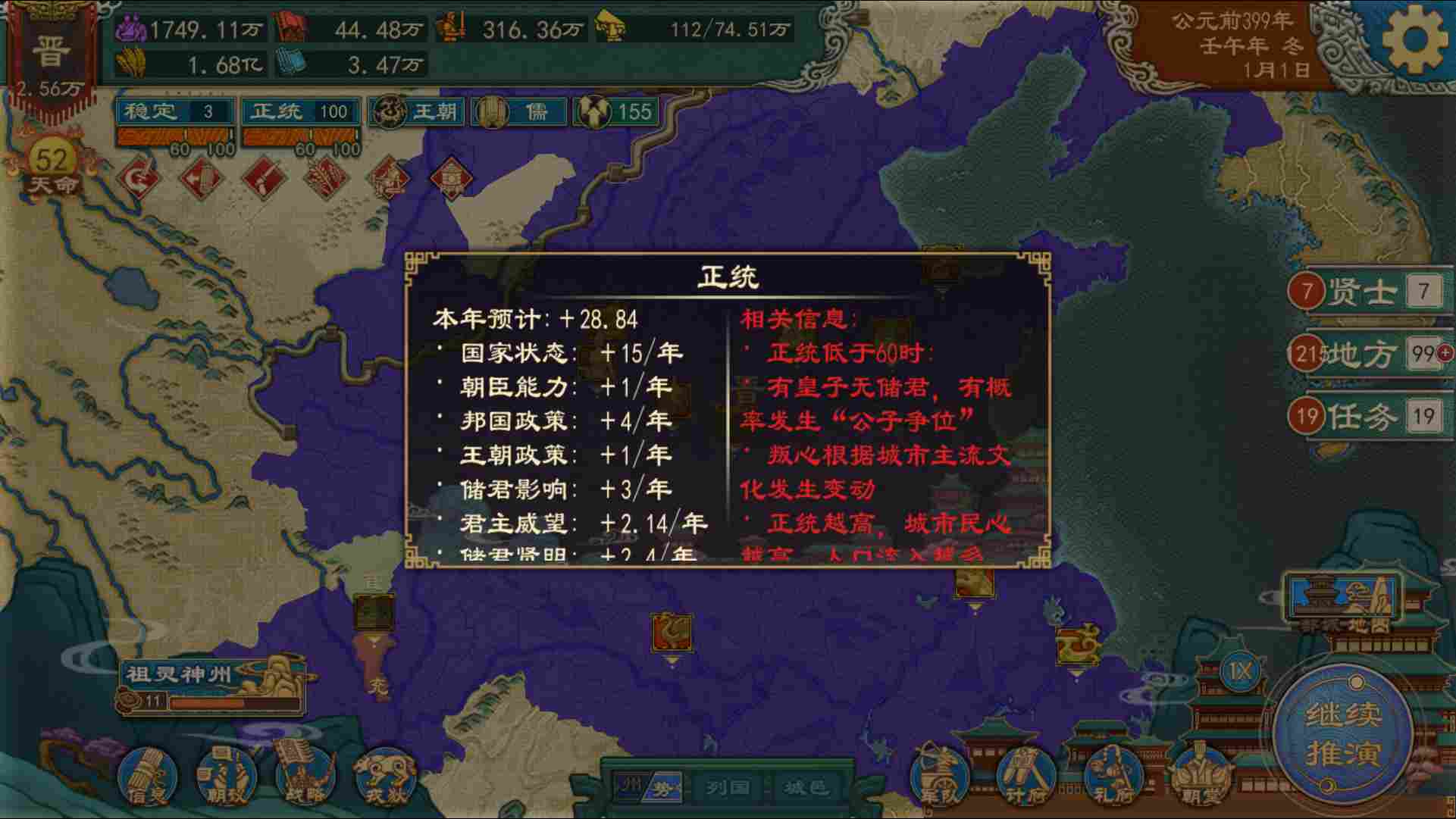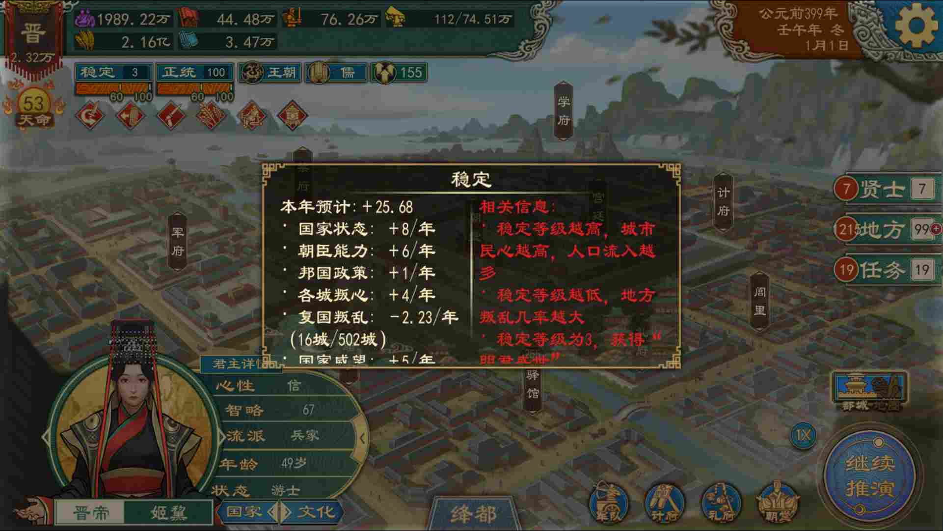 ●祭祀先祖、使用特定政策、设立储君,以及降低骚乱,厌战和叛心等会提升稳定