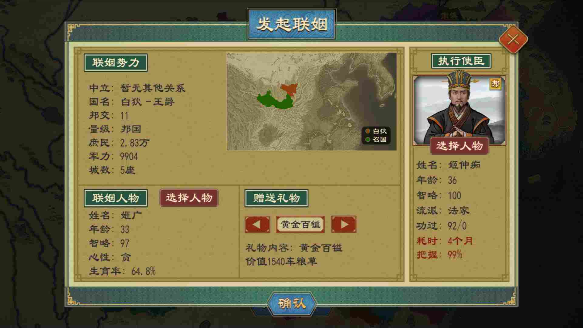 ●若需要与他国联姻,则需在目标国家或目标国家城邑界面选择【联姻】,派出使节提出联姻,并进行一系列礼制相关进程后完成婚配