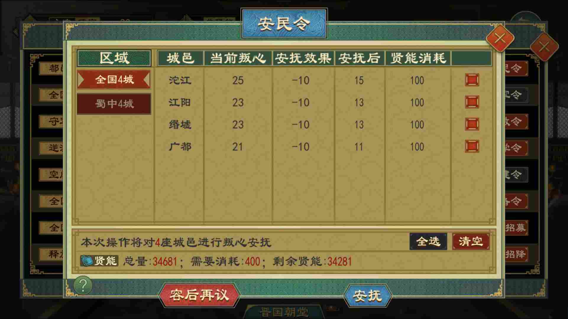 当叛心过高时,最快捷的方法是使用公府律令内的 【安民令】 ,消耗部分贤能值降低叛心。除此之外也可以通过对叛心过高城邑进行人口迁移、调低税率、减少隶工和预备役等方式来降叛心。