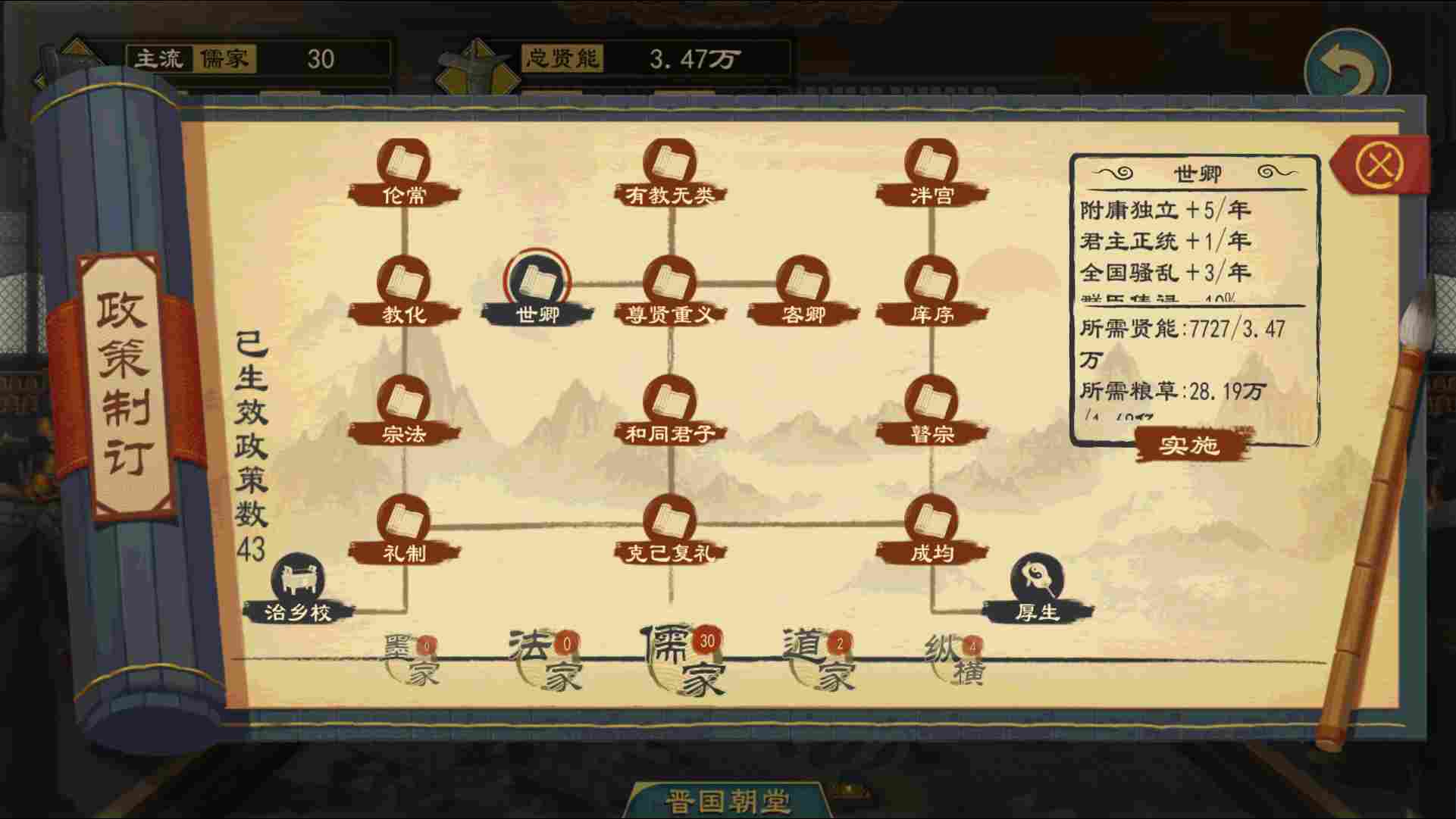 ●法家朝臣可以施行任意流派的政策,但成功率和效果会有所降低,其余流派的朝臣只能施行自己流派的政策