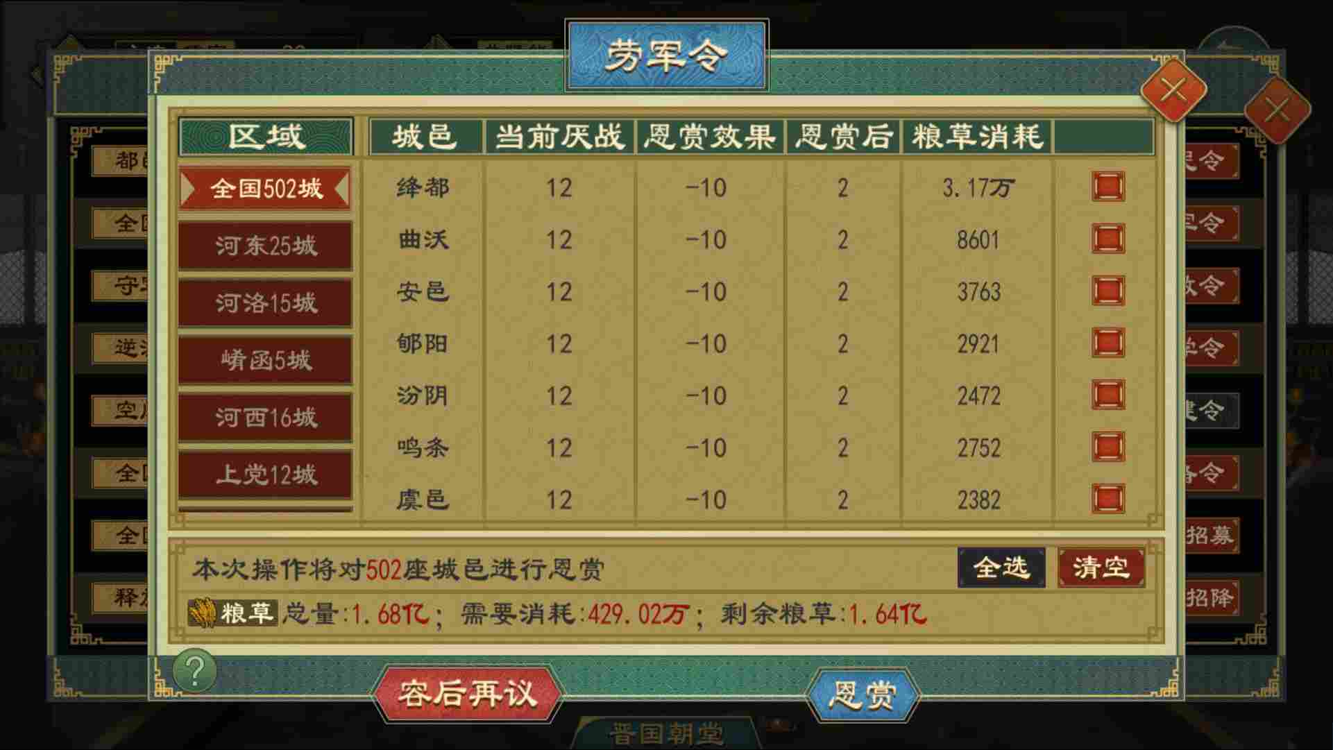 ●厌战降低该城邑的预备役