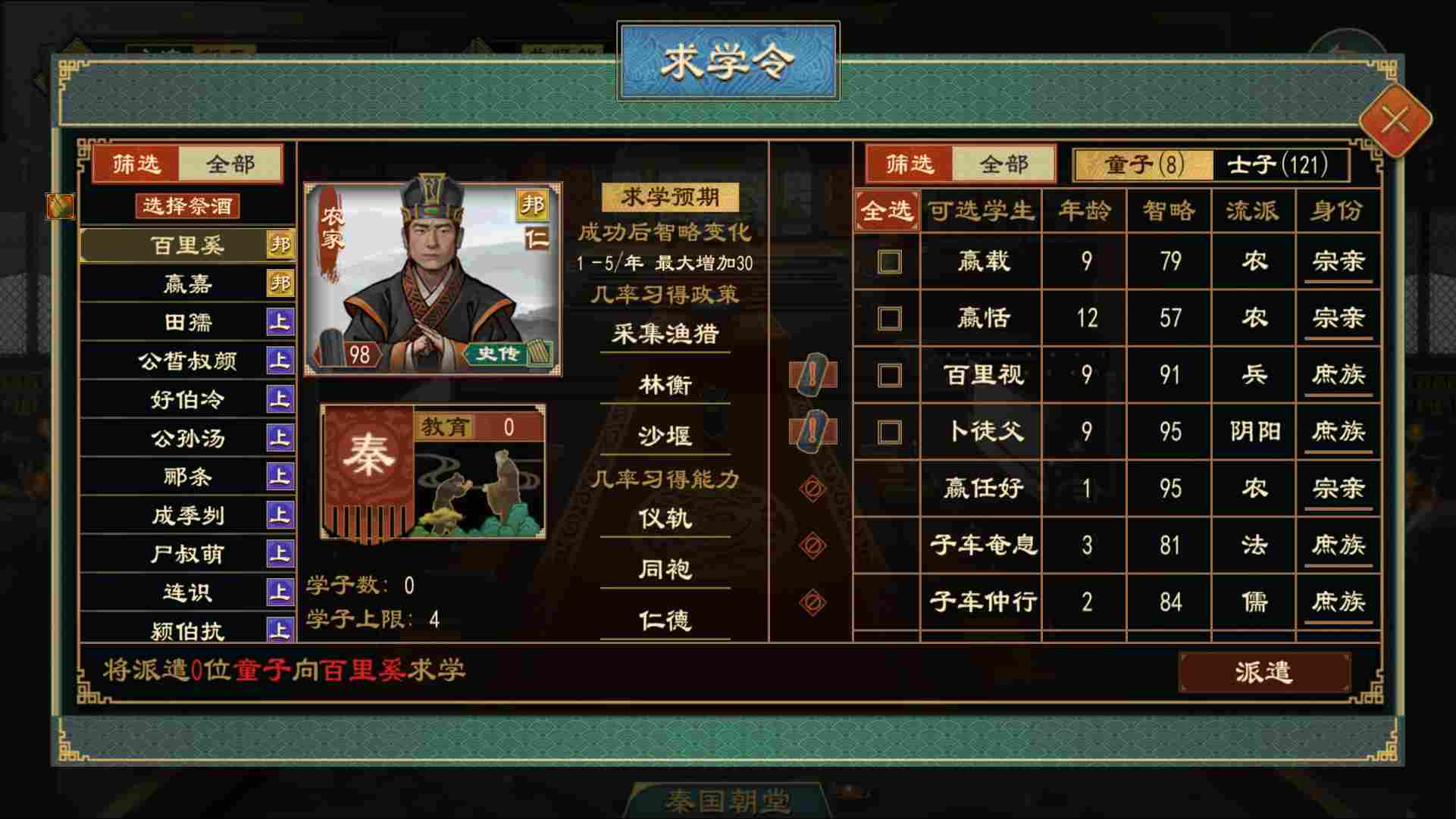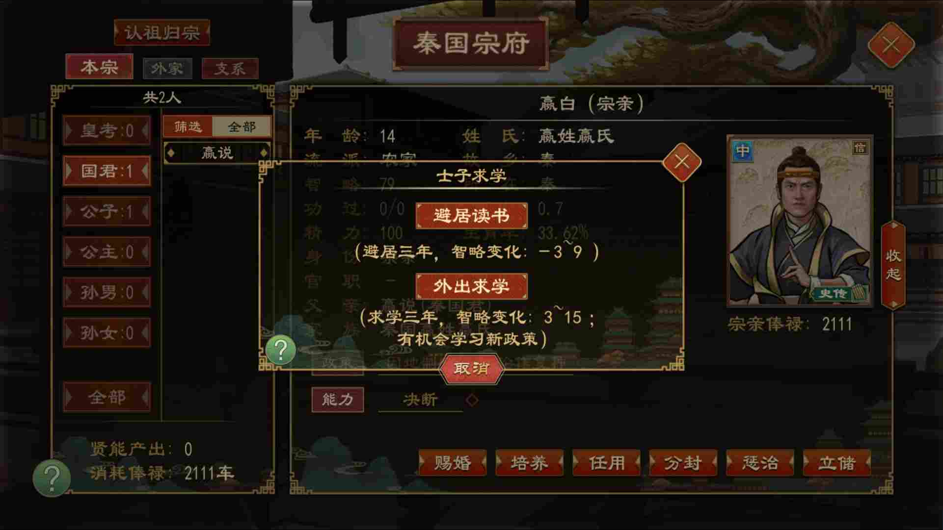 智略在游戏中是比较重要的设定,不同职位人物的智略高低影响了贤能产出、人才吸引力、谍战能力、军队战力等各个方面。求学有机会提高人物智略,在人才幼年时将其派出求学可以为后续人物担任职务提供更坚实的基础。