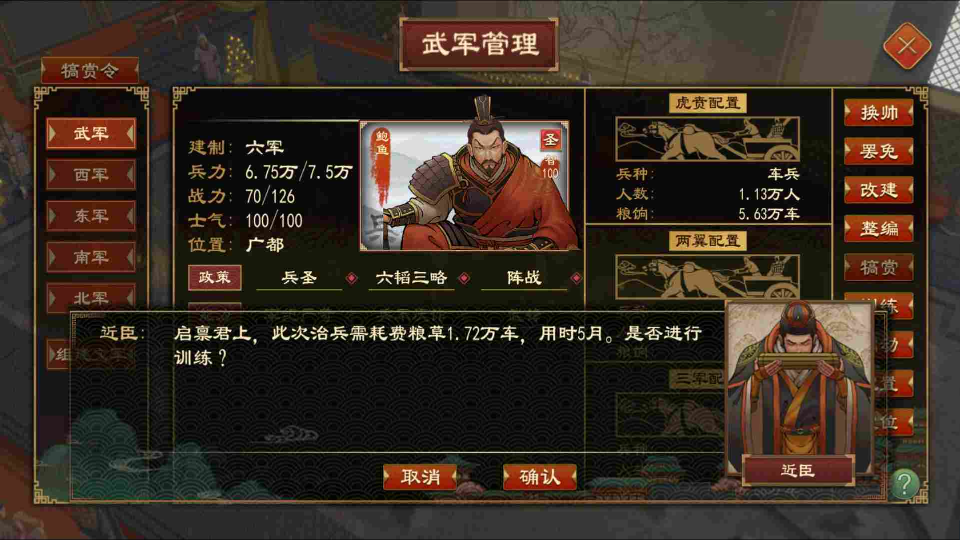 军队的战力与士气会影响作战表现,战力与士气越高,作战能力越强。在军队空闲时,可以进行 训练和犒赏 操作,保持军队战斗力,以便随时应战。