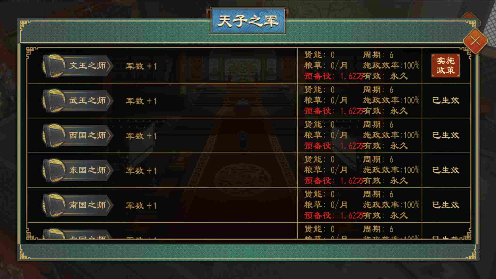 实施政策可以为国家带来各种效果,例如提高财政收入、战力、谍战能力、城防能力等,不同流派有不同的能力侧重点,当游戏进行到中期,便需要尝试通过施行政策来提高国家整体实力。