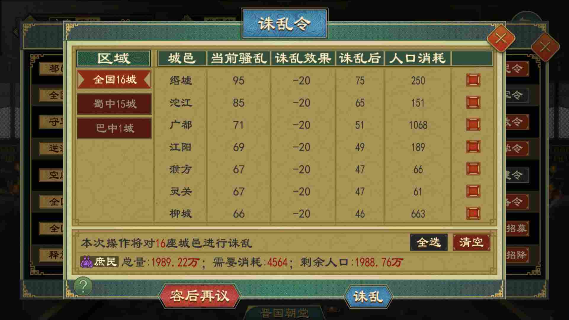 当骚乱过高时,最快捷的方法是使用公府律令内的 【诛乱令】 ,消耗部分人口降低骚乱。除此之外也可以通过对骚乱过高城邑进行免役、免税,或者使用部分政策降低骚乱。