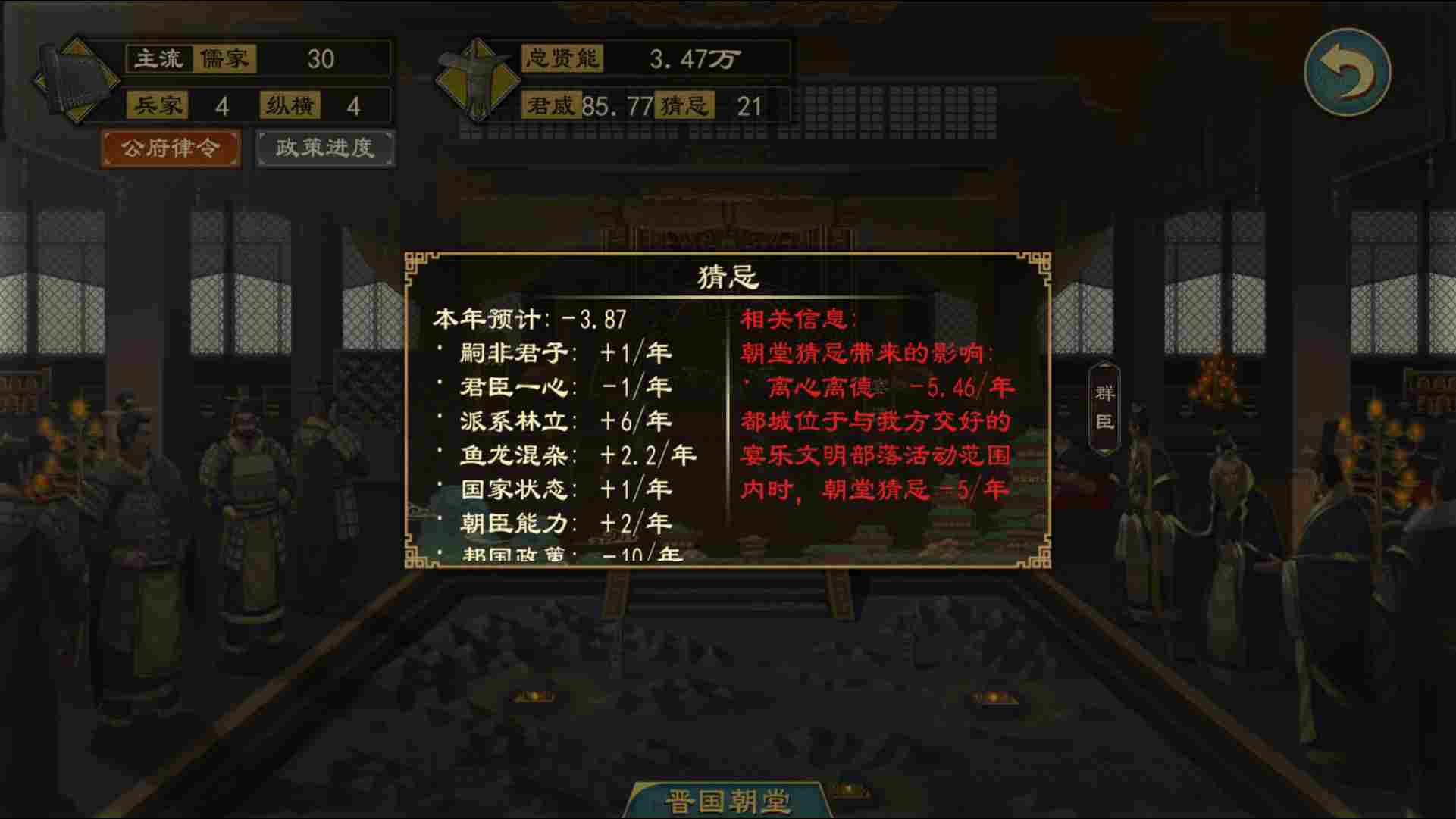 猜忌值升降的主要因素为更换朝臣、冢宰能力、朝臣流派数量、朝臣位置空缺、国君智慧、国君性格等,猜忌过高会产生部分负面效果,以及出现朝臣争吵等情况。当猜忌过高时,可以通过宴请、参与辩论、减少朝堂朝臣思想流派数量、更换维稳能力更高的冢宰等方式来有效降低猜忌。同时在朝堂内点击猜忌也会显示本年预计猜忌值变化,方便进行有效应对。