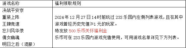 温馨提示:符合条件如未收到系统通知的玩家,可前往233乐园app,点击我的页面-客服入口,联系客服申请补发。关怀福利金活动截止至2025年1月25日24点前,如逾期未及时领取,将视为您放弃该福利,请及时联系申请。
