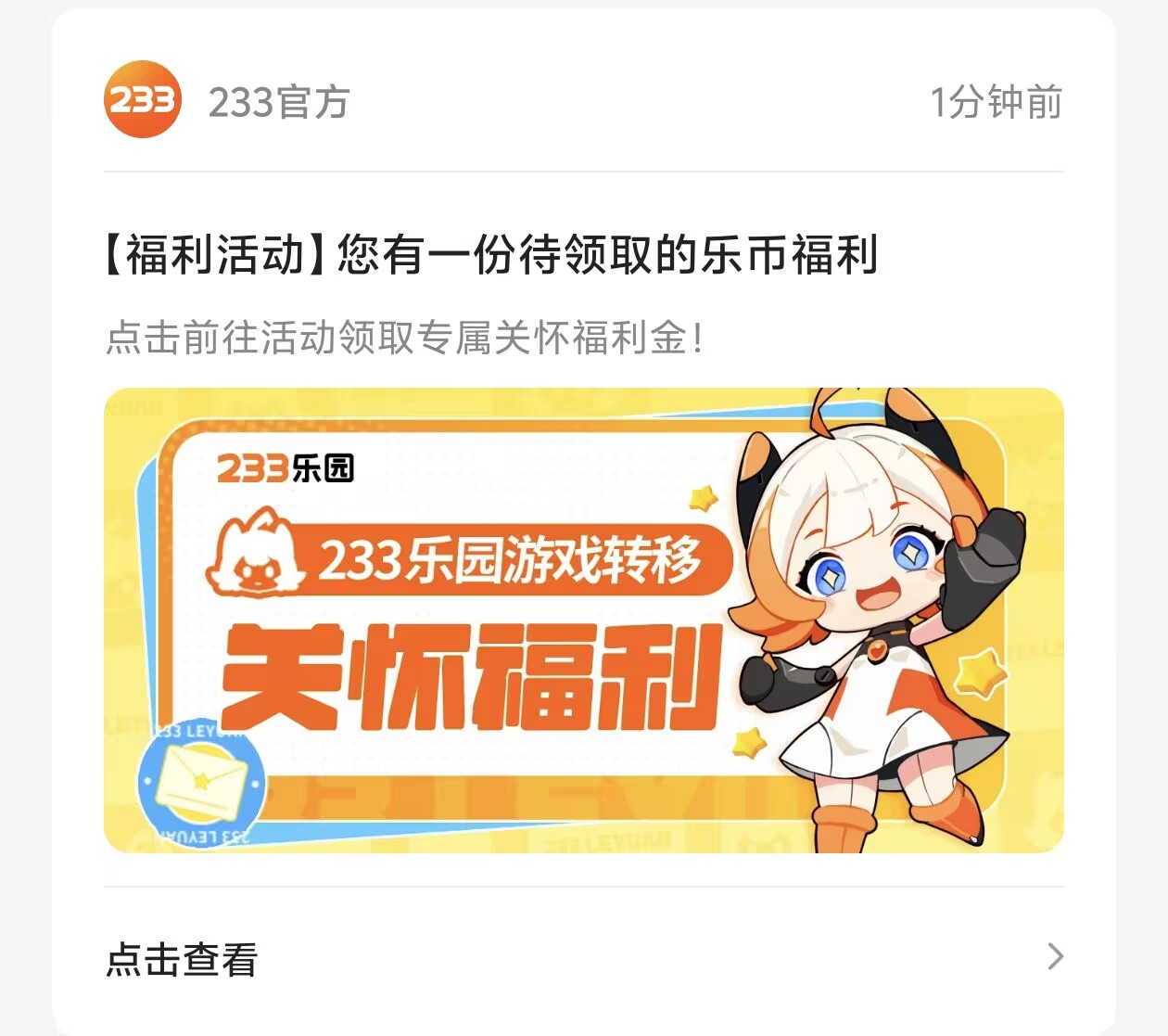 233乐园特别提供以下游戏转移关怀福利,收到系统通知消息的玩家,点击消息即可进入活动领取关怀福利金。