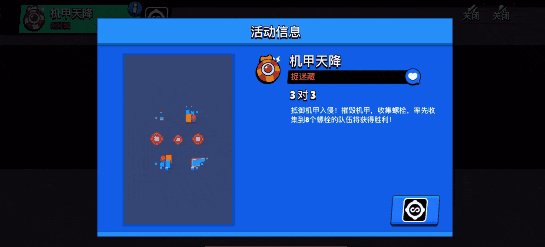 机甲天降:地图中央定时刷新机器人,击杀机器人后会掉落螺丝配件。双方竞争收集螺丝配件,率先集齐 8 个的队伍获胜。