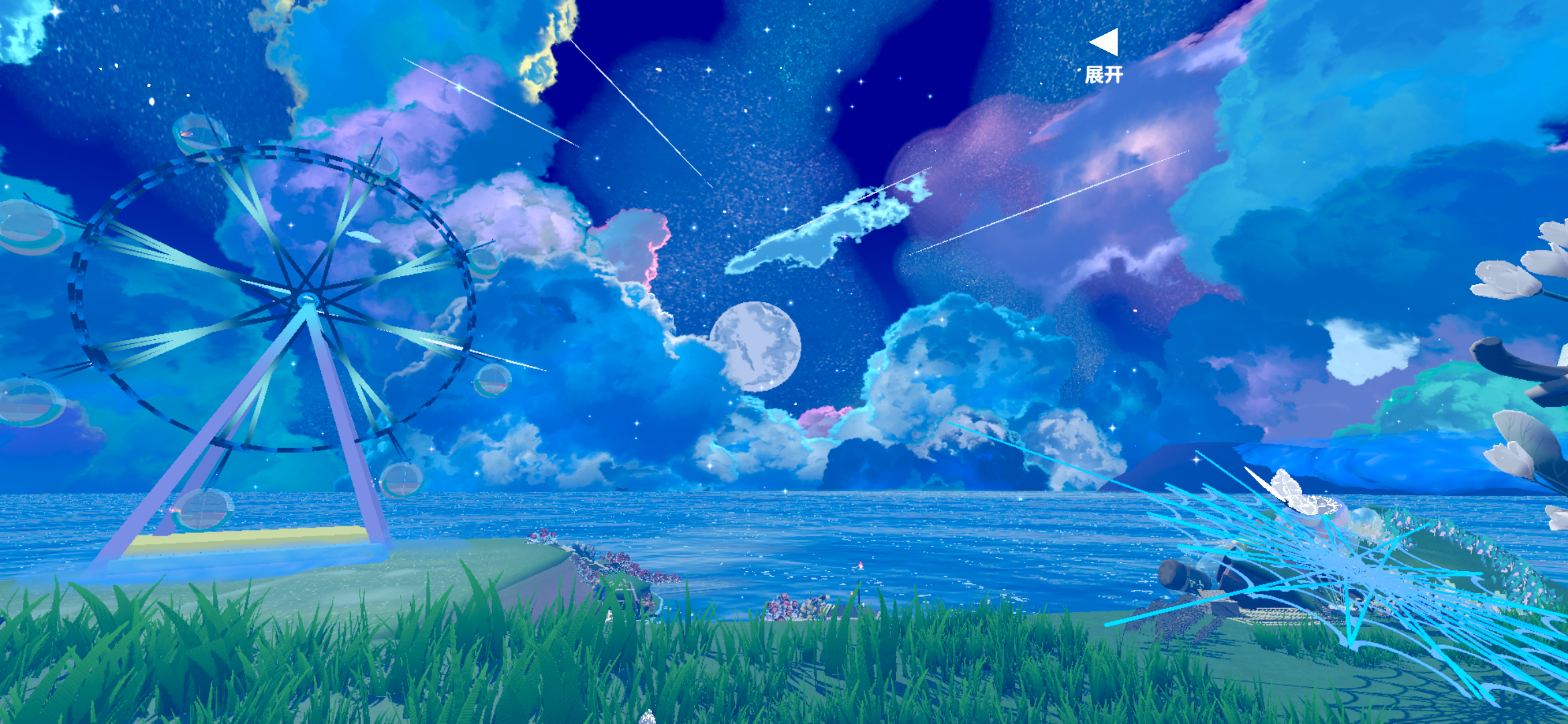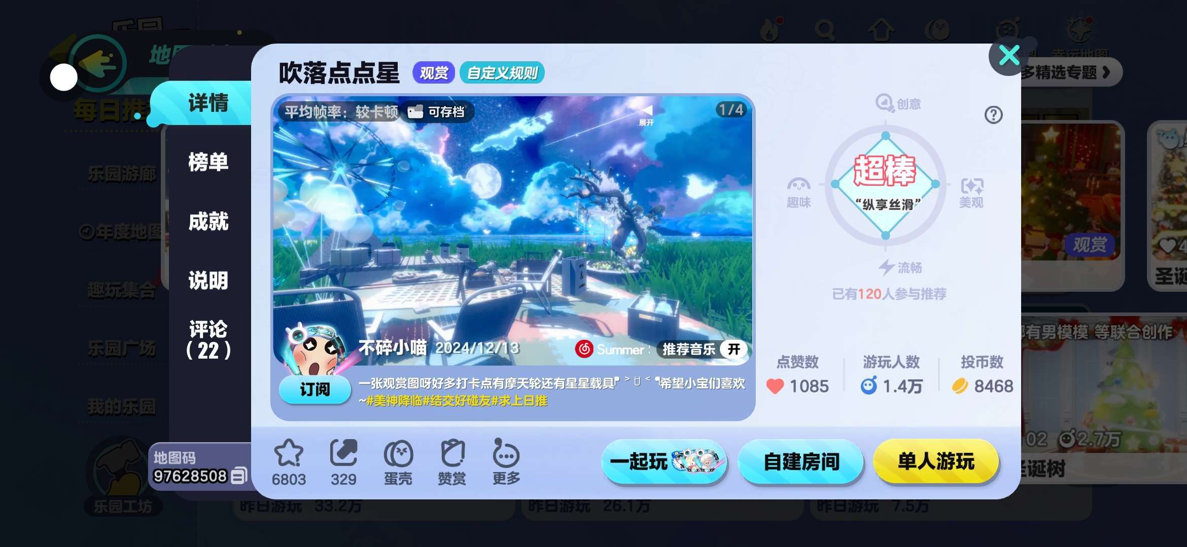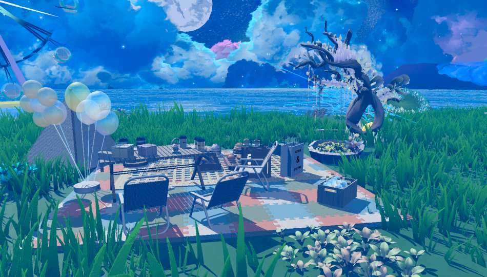 这张图为观赏图,图的背景是星空,暗淡的云彩、点点星环月、一瞬消失的流星再配上这一个个设施(小木船、摩天轮、小屋等设施),呈现出了一种独特的美感,终点前面还有个小屋,有一种淡淡的朦胧感,家具还是挺齐全的,成片很好看,很不错嘟 •͈⚇•͈♡̷ ⚝────⭒───⭒───⭑───⭒───⭒────⚝