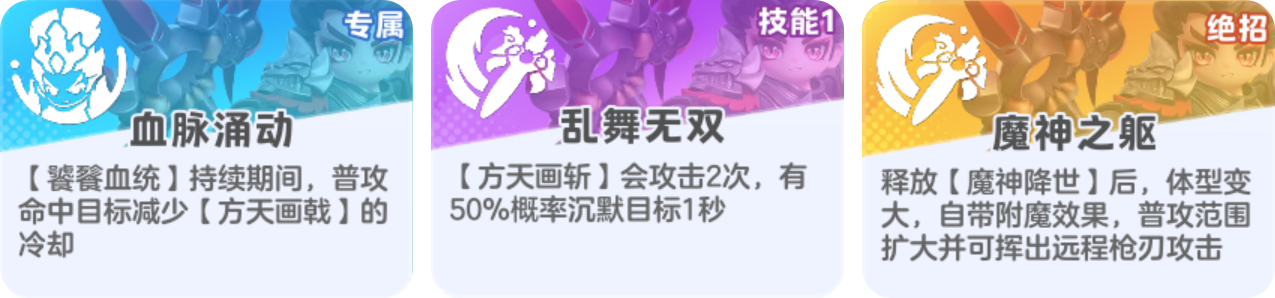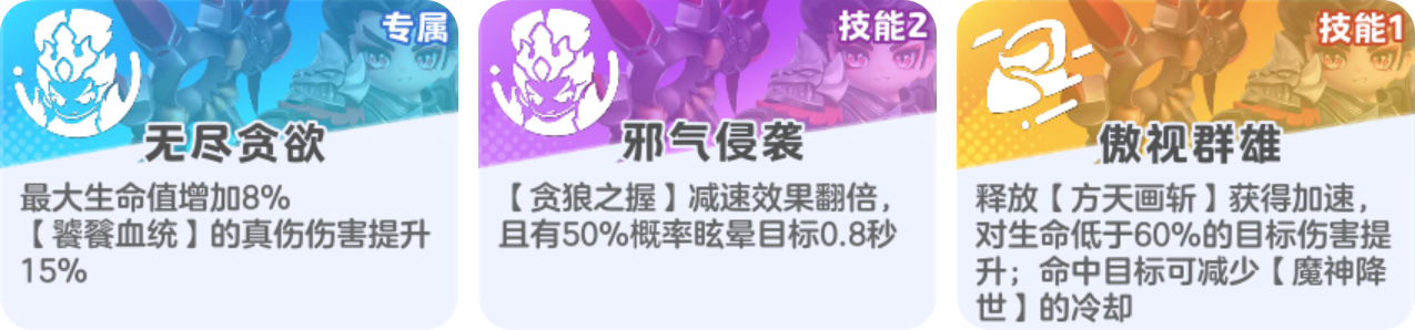 想要把吕布的真伤发挥到极致,星妹比较推荐这组卡牌:血脉涌动+乱舞无双+魔神之躯。