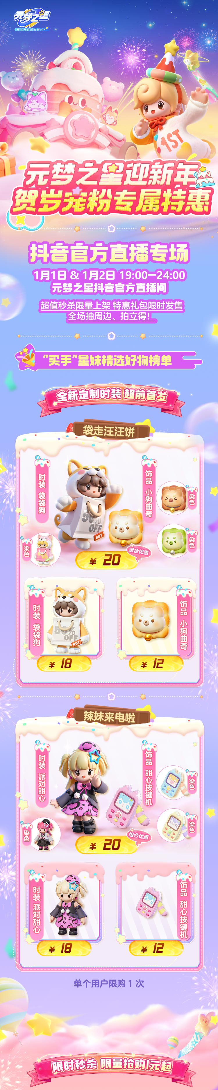 元梦之星迎新年,贺岁宠粉专属特惠来啦!全新定制时装首发!时装 袋袋狗、派对甜心以及饰品小狗曲奇、甜心按键机初亮相!全新时装 蜜罐小熊、饰品 桃子背包、阳光柠檬秒杀低至1元起!农场季卡破价首发,农场人又幸福喽~爆款农场装饰甜兔仙踪优惠返场!更多超值福利…锁定抖音【元梦之星】官方直播间,1月1日&1月2日19:00—24:00,星妹与你不见不散!