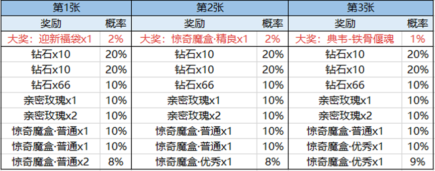 第一张:迎新福袋(打开后随机获得以下奖励其一:遗忘之水(赛季)、改名卡、排位加星卡、排位保护卡、春江跃鲤、限时语音)