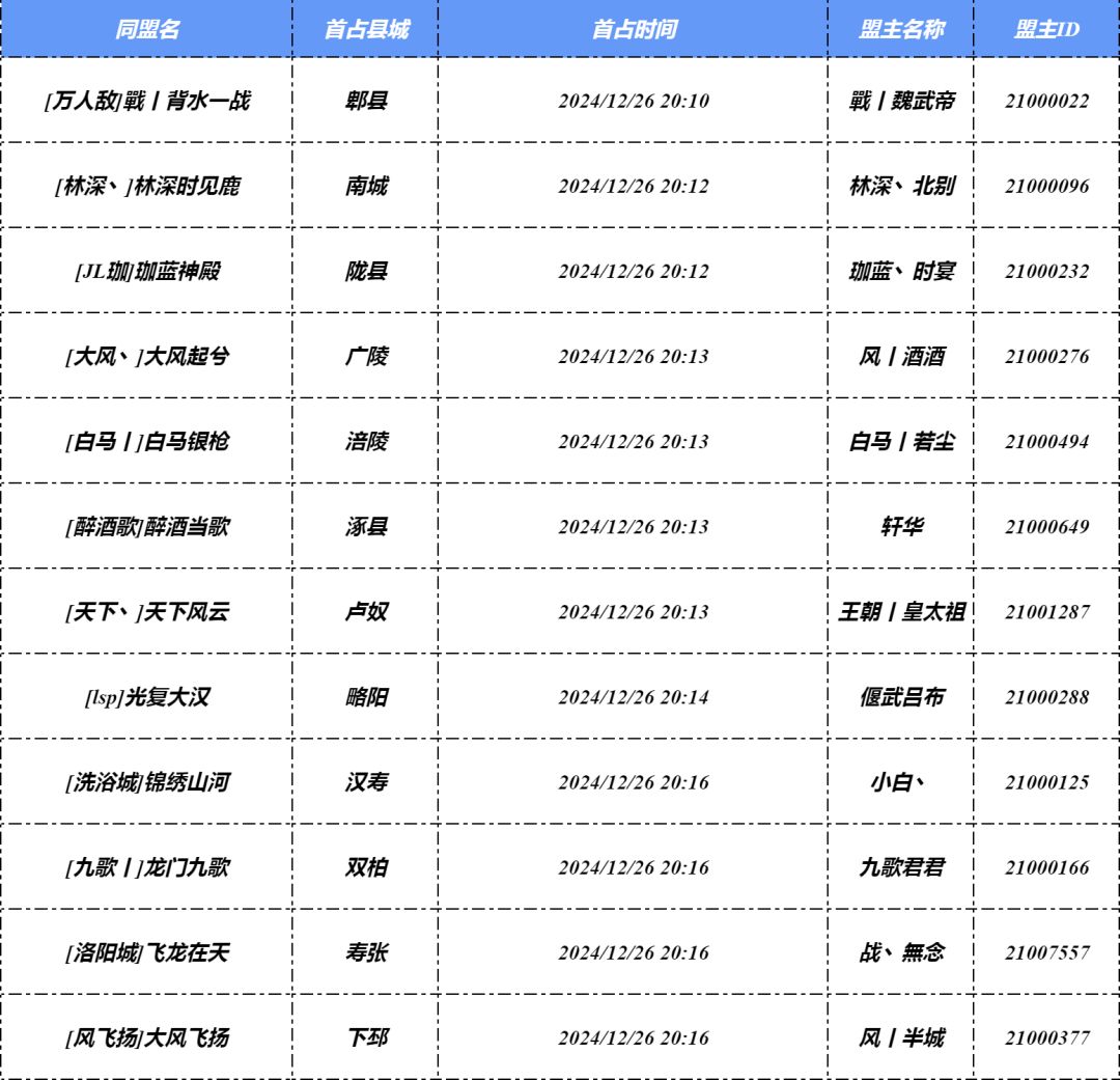 各位主公好,这里是阿武!咱们“演武测试”攻城冲榜活动第一阶段——1级县城首占最快的前12名同盟奖励名单已经出来啦,各位主公快来看看有没有你们盟吧!