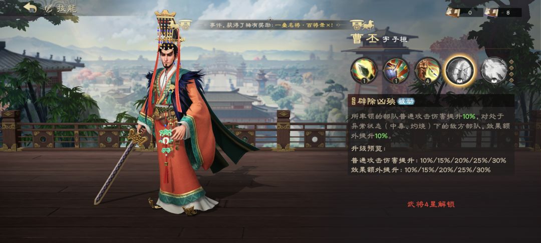 曹丕提升点同样为3、4星技能,3星技能可直接提供两种有效增益,需要优先升级,4星技能基础加成较低,后期多部队协同作战时再提升。曹丕觉醒效果为提升弓、骑兵防御,不属于该阵容核心增益需求,不建议刻意追求觉醒。