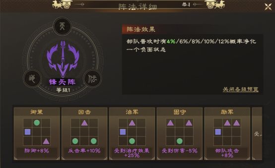 锋矢阵能让部队每次普攻都有几率净化负面状态,可用于预防重伤,对刘备治疗表现帮助极大。鹤翼阵则主打反击概率加成,能提升队伍输出能力。
