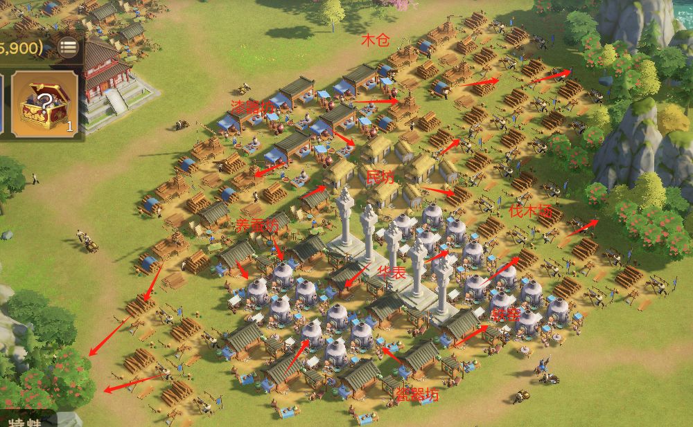 1. 由于【铁窑】占地非常小,且华表占地也非常小,若有一块儿地方可以展开足够多的建筑,将铁窑和华表集中摆放所获民心值颇高;