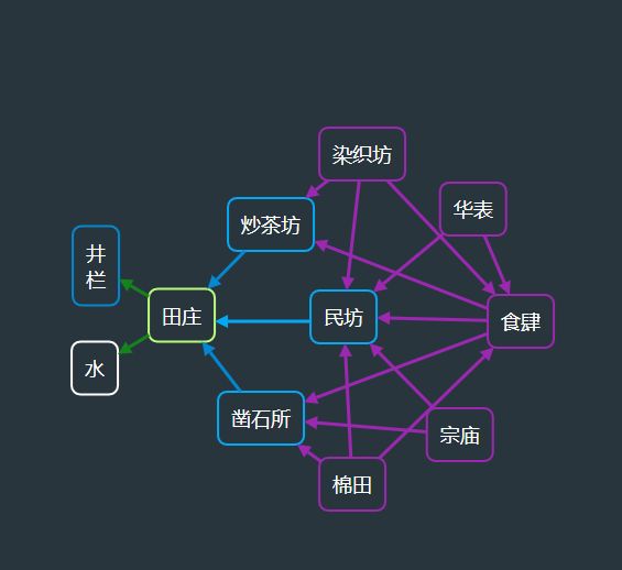 2. 蓝色图纸:分为可覆盖农田(即田庄)的炒茶坊图纸、凿石所图纸和可覆盖伐木场的木仓图纸和铁窑图纸。另有可同时覆盖农田和伐木场的民坊图纸和可以被农田覆盖的井栏图纸;