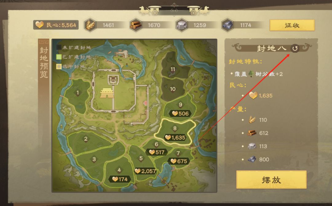 比如某一区域临水,则只摆农田及农田相关的建筑,或者只摆农田及炒茶相关的建筑,或可较大限度的获取【民心值】。如下图所示: