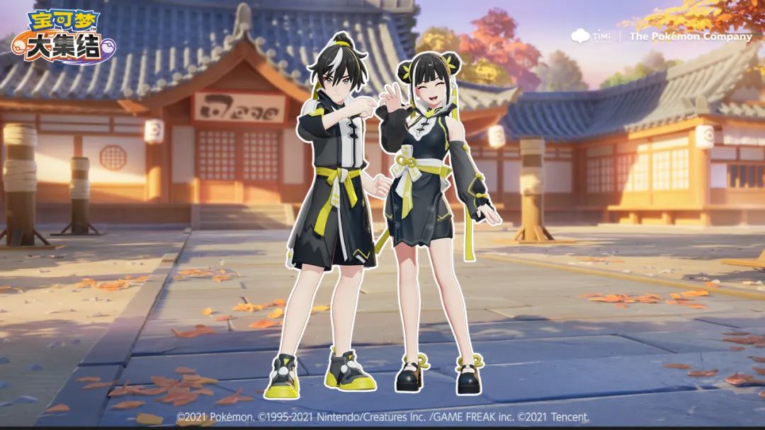 女款训练家上身为武道熊师同色系武功服,丸子头搭配黄丝珍珠发带,十分可爱,宽大的立式衣领,在跋山涉水的路上遮挡风尘,质地考究、可塑性强的半身旗袍搭配武道熊师同色系束身腰带,干练十足。系着黄色蝴蝶结的半袖护手,保证动作灵巧的同时也能带来不错的观感。