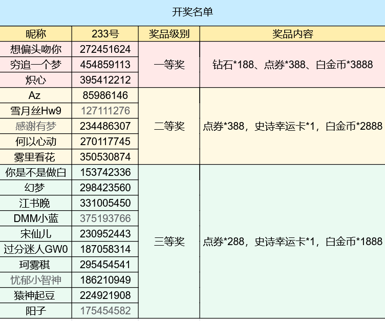 · 在回答正确的评论中抽选3位玩家一等奖:赠送「钻石*188、点券*388、白金币*3888」