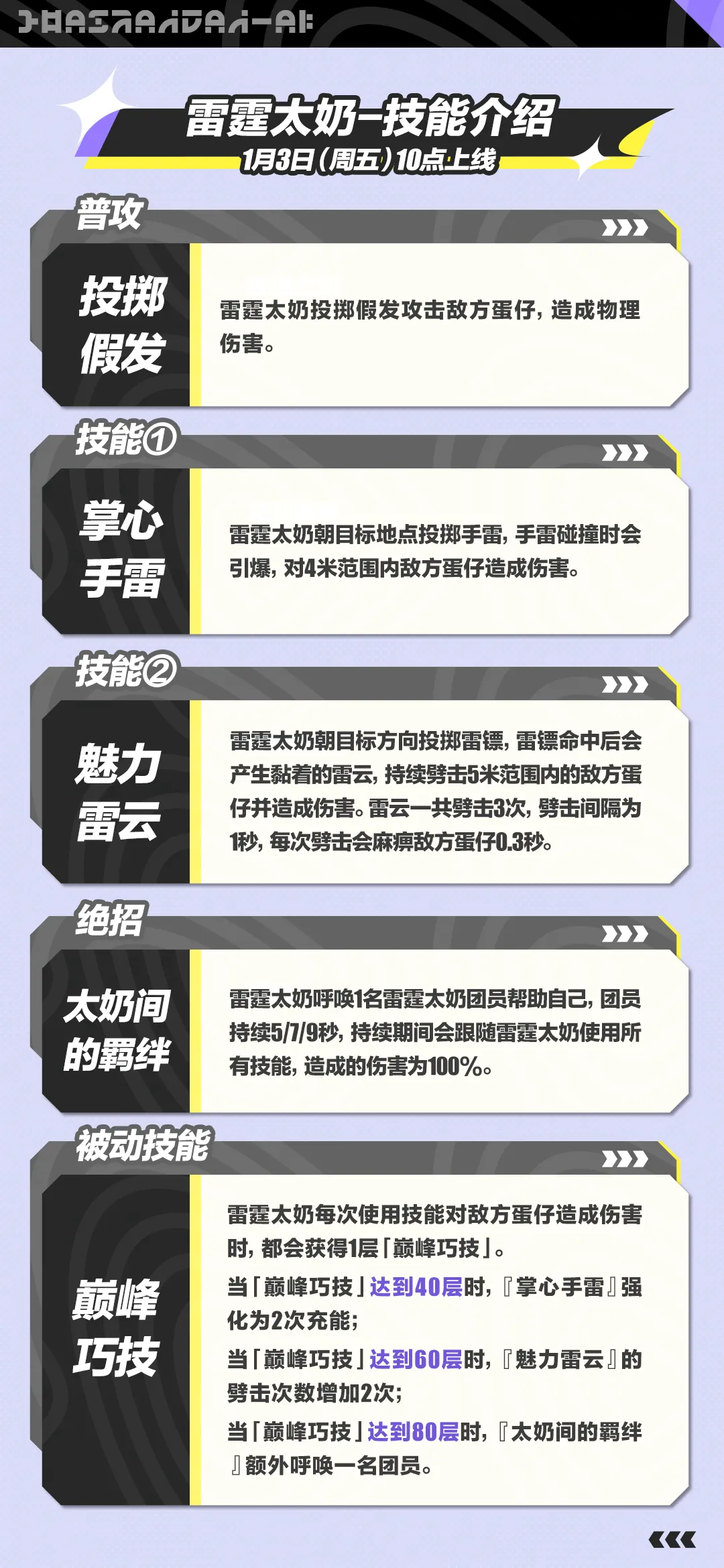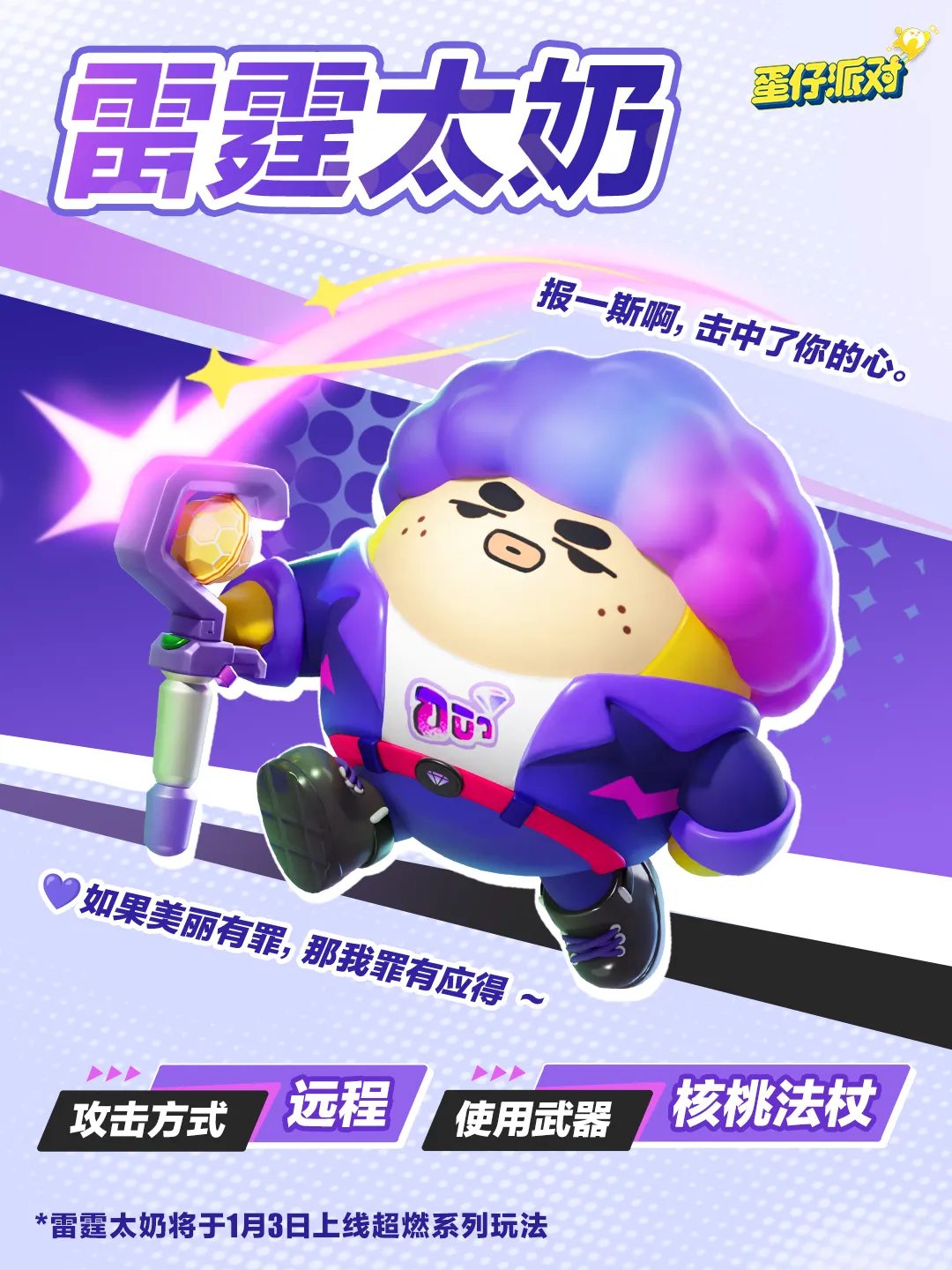 ①1月3日10点至1月16日,登录可在活动内免费解锁<彩虹爆炸头套装>,集齐套装的蛋仔将直接解锁“雷霆太奶”的永久游玩权限。