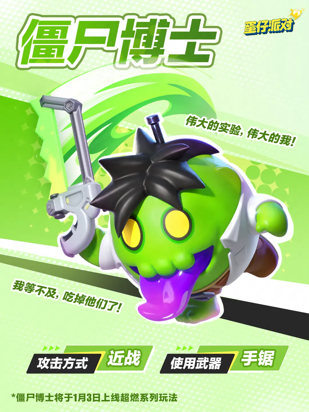 1月3日10:00至1月16日,蛋仔们参与活动即可获得“僵尸博士”的超燃蛋仔限时游玩体验卡。