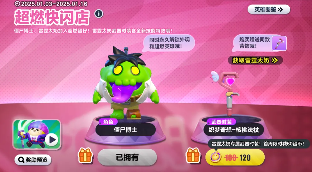 ②前往[热销]-[超燃快闪店]消耗800枚蛋币购买外观<僵尸博士>,并解锁永久游玩权限。