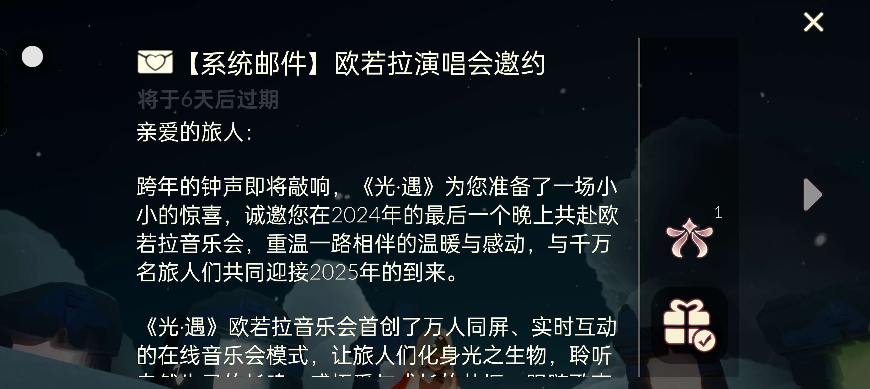 【更新公告】《光·遇》宴会节已于12月24日开启! 12月24日~12月31日每日登录游戏,可随机获得雪球发型魔法*1或雪球装扮魔法*1; 2024年12月24日~2025年1月7日达成累计登录天数,即可翻牌抽取随机奖励,活动期间完成全部登录任务,即可领取爱心*2; 此外 ,活动期间完成任务将获得爱丽丝围裙套装礼包试用魔法及超多好礼噢~ --------------------------------------- 《光·遇》是制作人陈星汉历时七年的全新力作。在《光·遇》中,你将开启一段最暖心纯粹的社交冒险体验。清新治愈的唯美画风,不期而遇的真挚美好,柔美的风云间充满着温暖与感动,唤醒你心中最柔软的部分。这是一场拥抱自由和温暖的云端之旅。与你心爱的人们携手,在这座旷世的天空王国中翱翔,爱的力量将支持你一路前行。