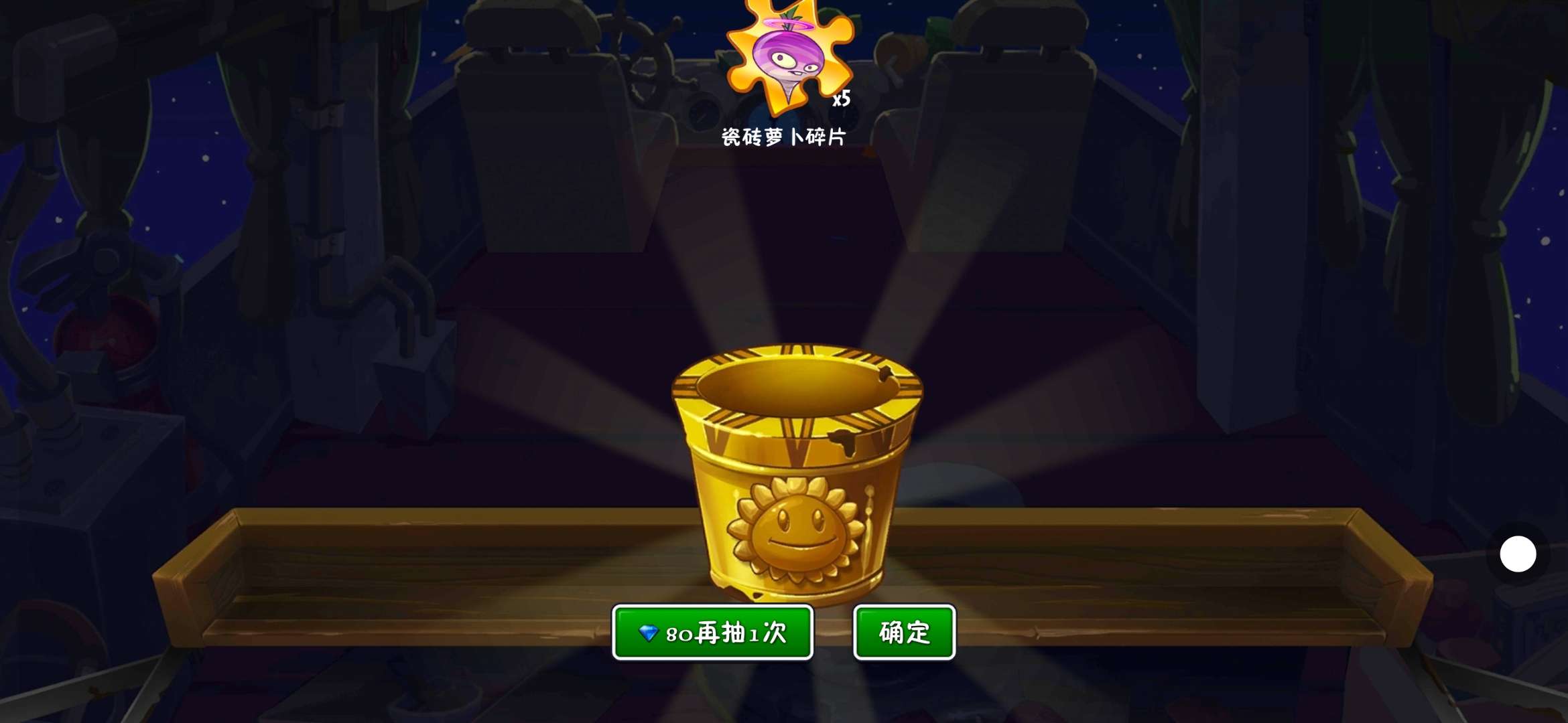 一年前我抽退游大礼包抽中了半个,然后昨天又抽了一个退游大礼包想抽瓷砖萝卜的,然后没抽中😭😭😭,今天早上一觉醒来,看到砸罐子有个消耗20钻石的任务,把普通宝箱开了,又花20钻石,正好又开了一次,然后看稀有宝箱冷却好了,随便一开,免费得到了另外一半的瓷砖萝卜😃😃😃,我也是有瓷砖萝卜的人