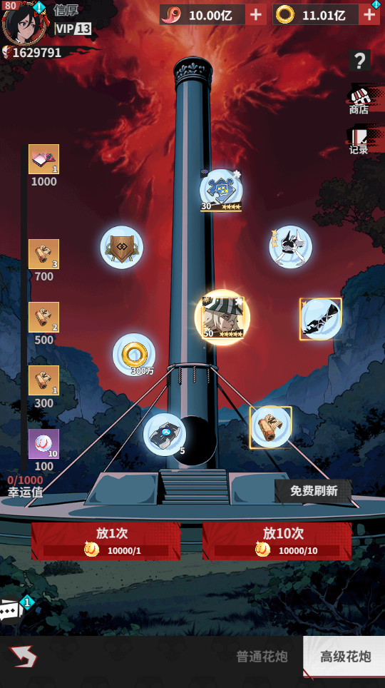 每次开炮均有机会获得:强力装备、五星强力角色、随机四星角色等。