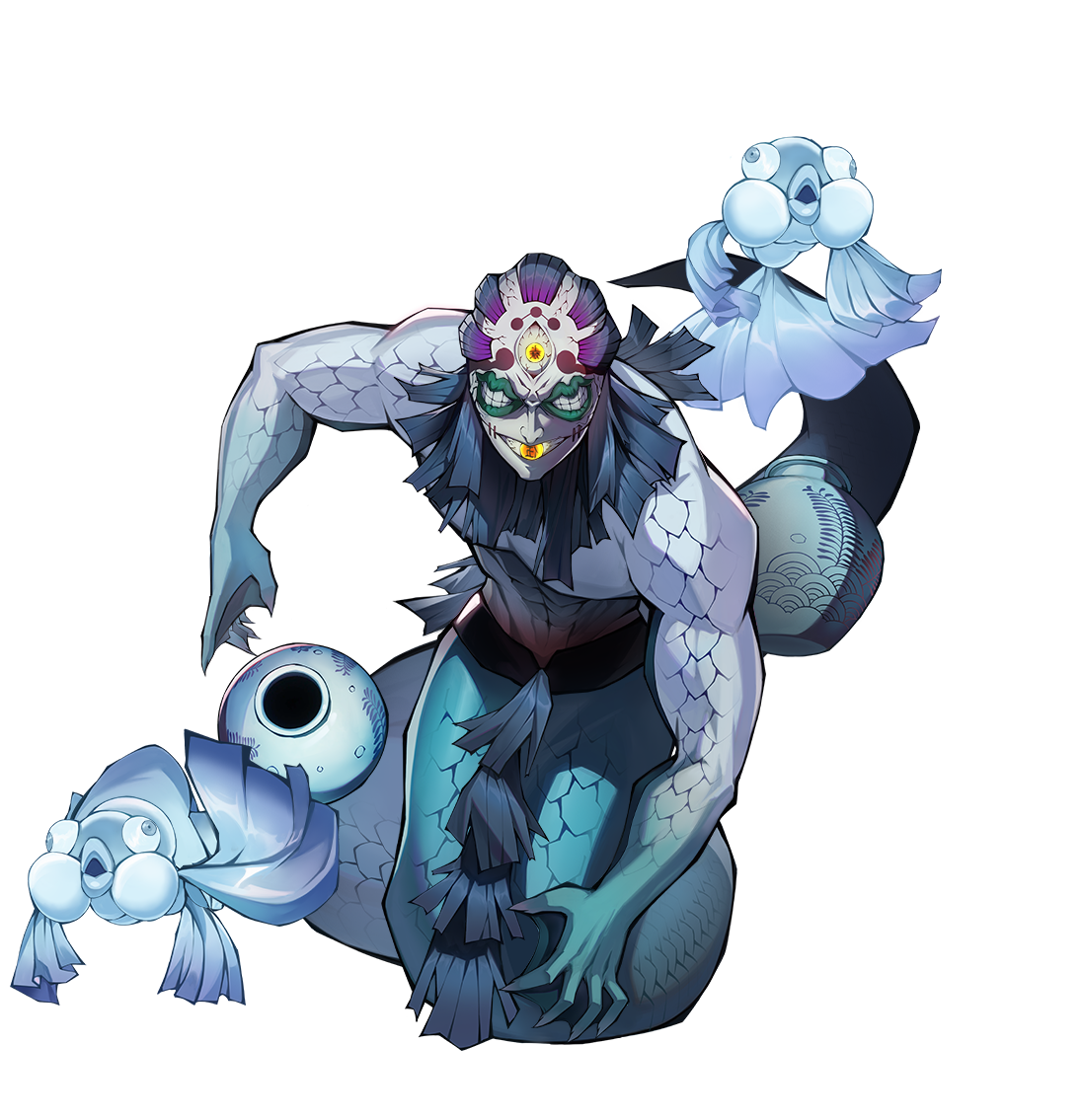 鬼舞辻旗下的精锐「十二鬼月·上弦之伍」,口眼错位,头顶带鱼鳍,头上也长着许多只小手臂,身体与壶相连,是十二鬼月中外貌最像人外姿态的异形鬼。