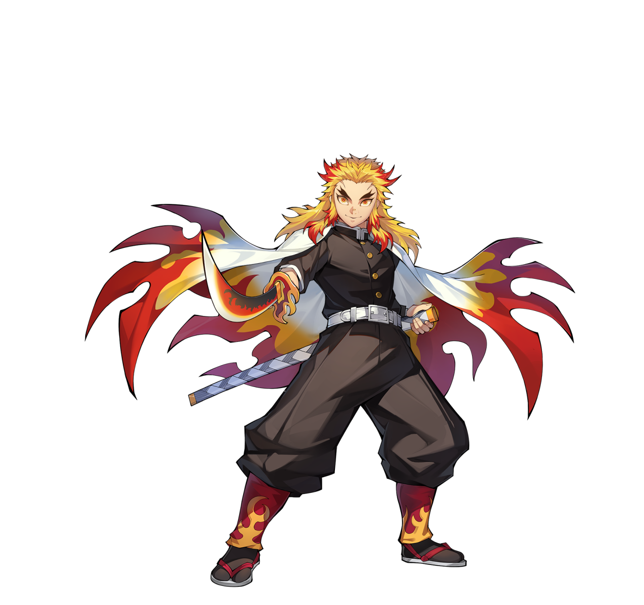 炎柱。20岁,有着一头黄红色相间的长发。日轮刀刀纹定大焰图案,刀锷为炎型,鬼杀队制服里披着火焰图案的羽织。