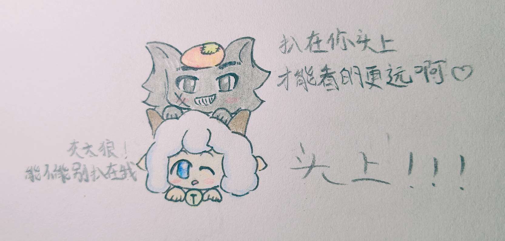 “灰太狼!能不饿别趴在我头上!” “趴在你头上才能看的更运啊!”