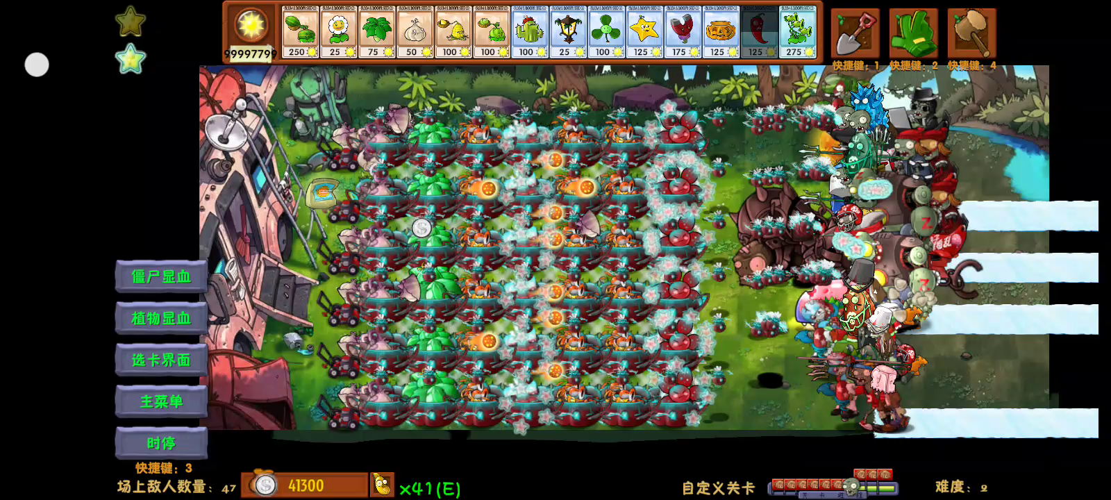 温馨提示: 本游戏是由B站UP主蓝飘飘fly 开发制作的同人游戏,233乐园对该游戏进行收录供大家游玩体验。 下载使用产生的版权问题请自行负责,233乐园不承担任何法律责任,如果您喜欢该游戏请支持官方正版。233乐园不拥有任何权利,其版权归该游戏的合法拥有者。如果该游戏侵犯了您的版权,请将相关版权证明或授权证明发送到邮箱,我们将在24小时内删除该游戏。 ------ 当夜色降临,游戏舞台转换至神秘的黑夜,一系列前所未见的夜间植物闪亮登场。这些新面孔不仅种类繁多,而且各具特色,拥有独特的能力,为你的防御阵容带来无限可能。面对更加强大的僵尸敌人,你需要运用智慧,精心搭配植物,展开一场场紧张刺激的防守战。 2.1.5更新内容: 更新内容: 1、新增植物: 普通: 火焰西瓜投手、吸金磁、超级机械保龄球坚果、铁豆小喷菇、裂荚小喷菇、阳光磁力菇、魅惑磁力菇、磁力大喷菇、铁桶大喷菇、橄榄球大喷菇 特殊: 模仿者 究极: 究极魅惑菇、红宝石伞、樱桃南瓜、蒜神、究极五叶草、灰烬三线、浴火三线、魅后菇 2、新增僵尸: 钻石盲盒僵尸、机枪海豚僵尸、冲锋黑曜石小鬼僵尸、究极黑曜石巨人、武装巨人、豌豆海豚僵尸、三爷铁豆僵尸 3、优化内容: -花盆可以直接放在植物下方 -现在可以通过在豌豆小喷菇上放豌豆融合成双发小喷菇 -随机模式前期不再出究极僵尸 -降低瓜跳的大跳距离,同时大嘴可以吃任何跳跳 -大幅降低了使用究极樱桃射手和究极窝炬造成的卡顿现象 -加入了按Q显示植物血量,按W显示僵尸血量的功能,咖啡豆改为E键 -花园拓展,现在可以翻页,可以开出紫卡植物和金植物,加农炮除外 -将带究极植物的模式单独分开,可以在主界面点击【旅行钥匙】进入 -我是僵尸模式新增自定义模式,存档位置和原自定义关卡存档位置相同,名称为CustomIZ.json 2.1.6更新内容: 1、修复了生存模式“更多的僵尸来了”后放置僵尸盲盒导致下一轮无法过关的bug 2、修复了叶子保护伞、超级伞血量异常的bug 3、优化了叶子保护伞弹僵尸的扣血量,1个僵尸时扣100,2~4个僵尸时扣150,大于4个时扣250 4、修复了大麦可以变究极鱼蛋bug 5、修复了阳光过多导致变为负数的bug,现在上限为99999999 6、修复了手套在我是僵尸模式存在冷却的bug 7、修复了诸神模式肥料不会给一格全部植物回血的bug 8、修复了三叶草碰撞体积异常的bug 9、修复了吸金磁偶尔不能吸子弹的bug 10、修复了僚机不能优先攻击飞行僵尸的bug 11、优化了游戏失败界面,现在生存模式可以选择直接重新开始本轮游戏 12、修复了给魅惑磁力菇小丑盒会生成普僵的bug 13、修复了究极魅惑菇特效丢失的bug 14、黑曜石高坚果亡语修改为受伤时由全场所有黑曜石高坚果分担伤害