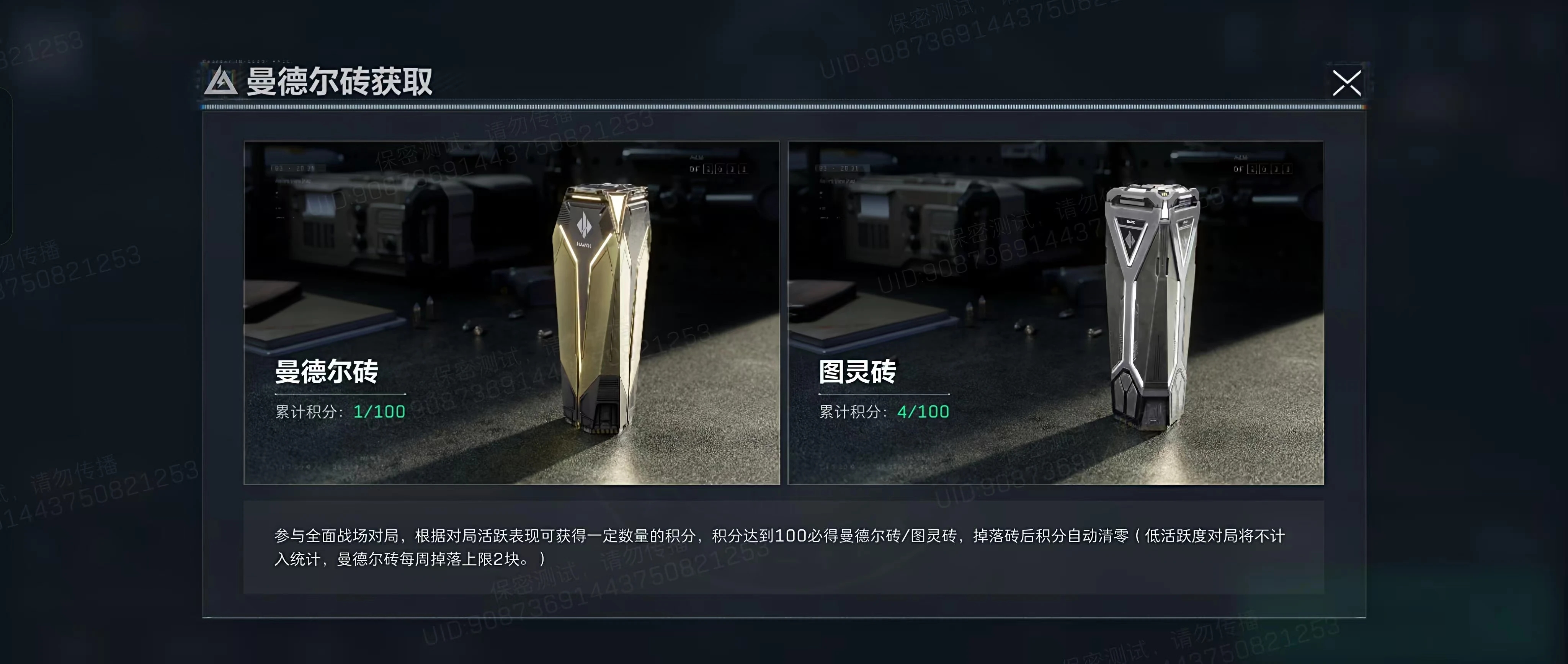 全面战场新增曼德尔砖保底机制,100把正常对局保底获得曼德尔砖和图灵砖,2个保底互不影响,提前出则积分清零。当天最多1个,当周最多2个。如果想肝的老狼建议占领模式完成,大约需要24小时保底获得~