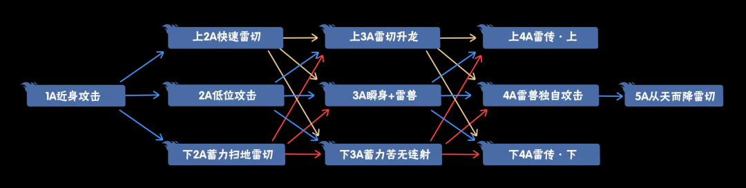 豚豚小贴士:普通攻击和上下特殊普攻在1A到4A之间可以自由衔接,在打完上/下特殊普攻4A雷传后没有后续,简单来说就是以下两种情况: