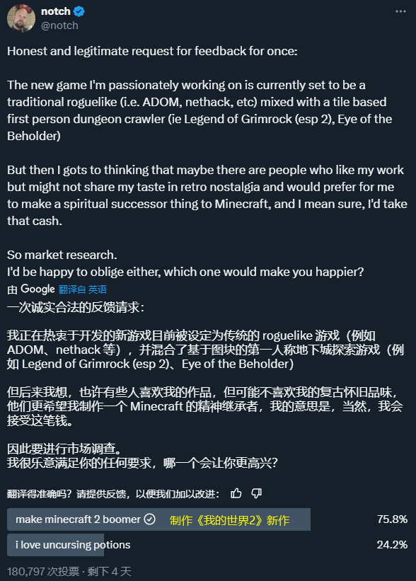 一开始他想做一款传统地下城探索肉鸽,不过考虑更多人都在期待它制作出一款《我的世界2》这样的续作,所以他想征集一下玩家们的意向再做决定。