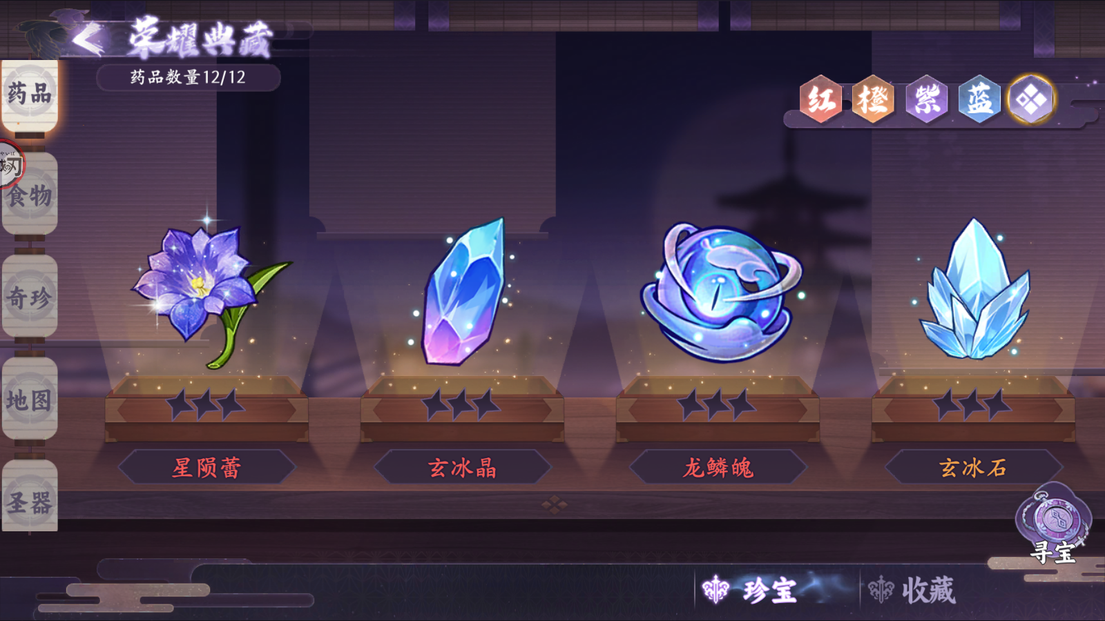 荣耀典藏:该系统为收集药品、食物、奇珍、地图、圣器等道具,并且可以进行升星提升属性。道具获取可以通过“寻宝”获得。