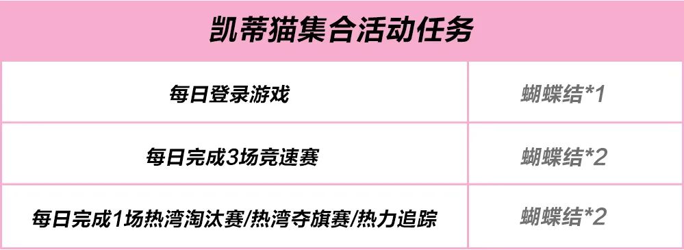 2025/1/10-2025/1/25活动期间,完成每日任务获得蝴蝶结,在活动页面使用蝴蝶结即可抽取丰富奖励!多重Hello Kitty联名好礼免费得,萌翻新年!