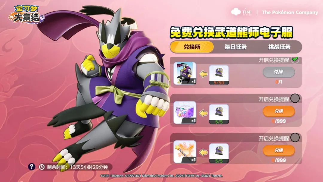 活动内容:活动期间,训练家可通过完成每日/挑战任务积累忍者手套,兑换忍者风格武道熊师电子服、皮卡丘烟花、牵绊糖果随机盒等奖励。忍者风格武道熊师电子服还带有炫酷的拖尾特效!完成任务还可额外获得亿奥斯币、亿奥斯能量、持有物强化组件。