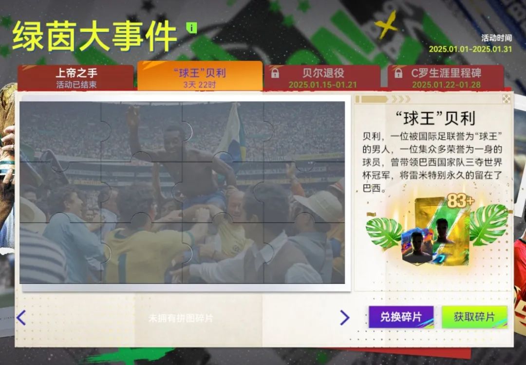 1、每一期活动对应4个发生在绿茵场上的大事件,每个时间需要集齐12个不同的碎片用以激活事件;