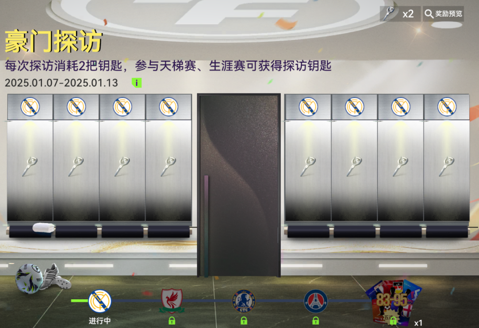 2.消耗探访钥匙可打开更衣室柜子,每个柜内均有奖励,如在柜子中找到球会钥匙,即可前往下一间;