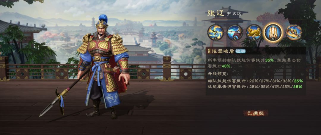 张辽4技能可同时提升技能伤害与技能暴击伤害,属于部队最核心的增伤技能,推荐优先升级。3技能有一定概率让主将在释放技能后获得大量怒气,实现连续技能爆发,为次选升级项。张辽觉醒技能有几率为主将提供高额暴击率加成,触发成功时可使吕布技能暴击率超过100%,但考虑队伍成型后暴击率已经比较可观,无需刻意追求觉醒。